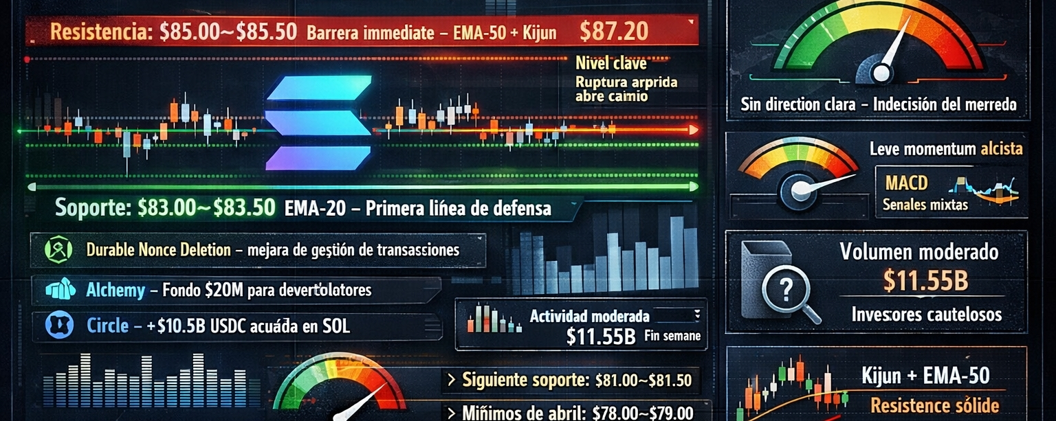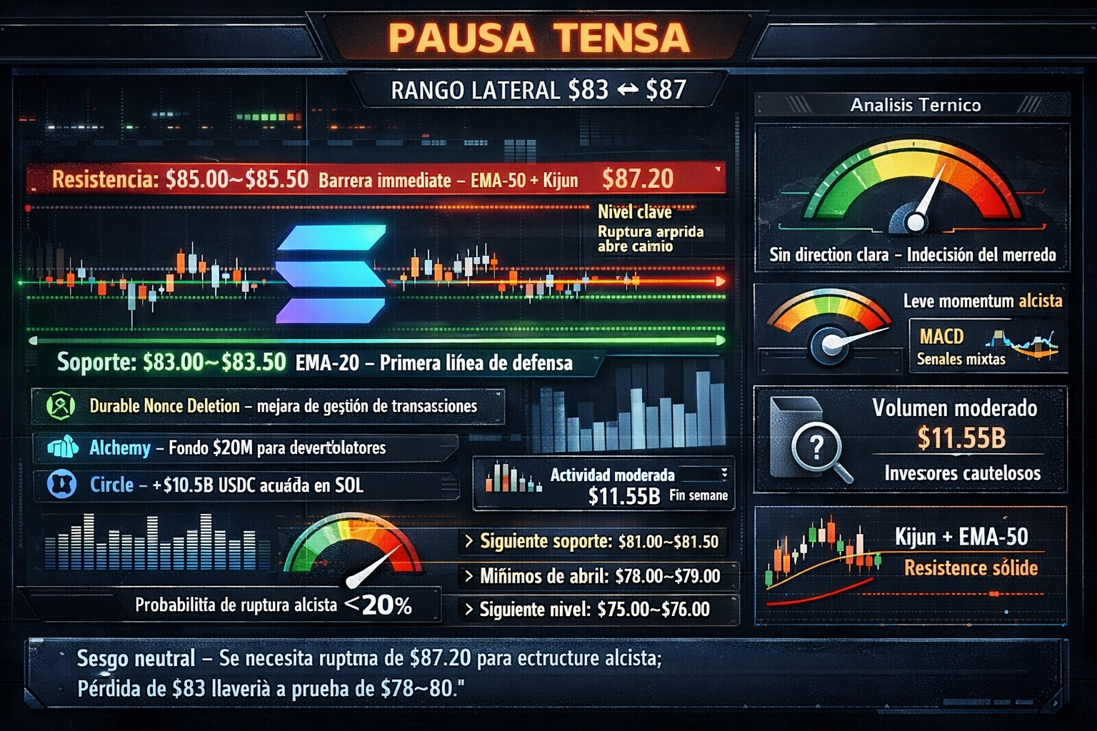 El analista Viktoras Karapetjanc de Traders Union señala que, aunque los indicadores de momentum son mixtos, el crecimiento del ecosistema (con Alchemy lanzando un fondo de $20 millones** para desarrolladores y Circle acuñando más de $10.5 mil millones en USDC en Solana el mes pasado) mantiene una perspectiva constructiva . La probabilidad de una ruptura alcista en el corto plazo es baja (menos del 20%), siendo el escenario base una continuación del rango lateral entre $83.50 y $85.50 .