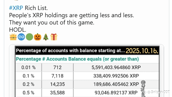 Un aggiornamento recente dall'analista crypto Cryptobilbuwoo0 fornisce un quadro chiaro della distribuzione attuale di XRP, mostrando esattamente quanto XRP è necessario per classificarsi tra il 10% migliore dei detentori. I dati provengono dal XRP Ledger al 16 ottobre 2025 e evidenziano quanto sia concentrata $XRP la proprietà è diventata.
