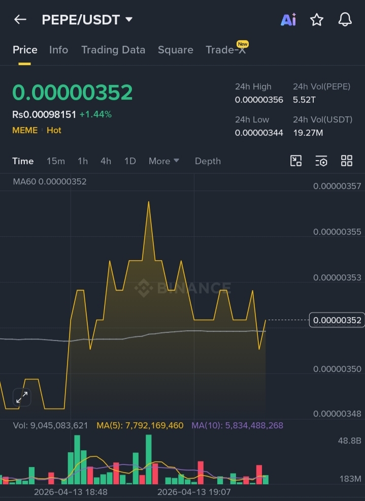 Trading Pair: PEPE/USDT, meaning you are looking at the price of Pepe tokens valued in Tether (a stablecoin pegged to the US Dollar).