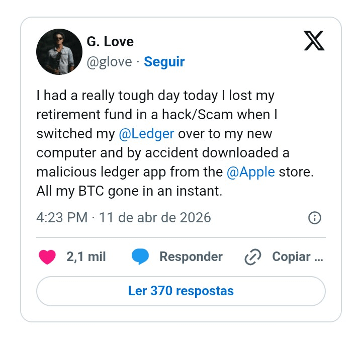 “Ô dia puxado, viu… perdi meu dinheiro de aposentadoria num golpe desses. Fui mexer na minha Ledger no computador novo e, sem querer, acabei baixando um aplicativo falso. Na hora, meu Bitcoin sumiu tudinho”, desabafou ele.