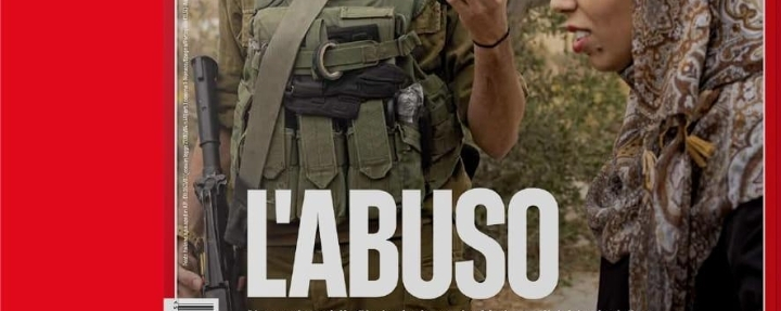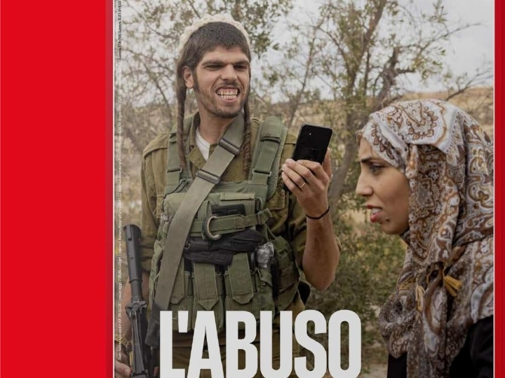 At first glance, the image hits hard. A uniformed man, symbolizing power and control, is seen mocking the pain of a Palestinian woman—recording her suffering as if it were entertainment. Above it, one word dominates the narrative: “L’ABUSO” — Abuse. Exploitation. Injustice.