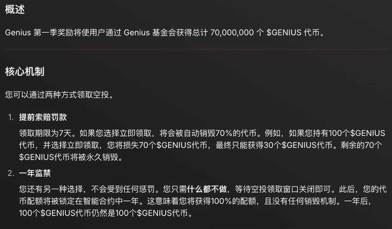 反撸过程:Genius被视为最后希望,然而社区疯狂刷交易量后,TGE迎来反转大礼包:7天内立即领取空投将自动销毁70%代币,最多拿30%;或选择锁仓一年才能拿全额。在汹涌的舆论压力下,项目方随后紧急推出“退款”选项 - TGE后48小时内,用户可选择100%销毁空投额度,换取Genius收取的手续费退款。