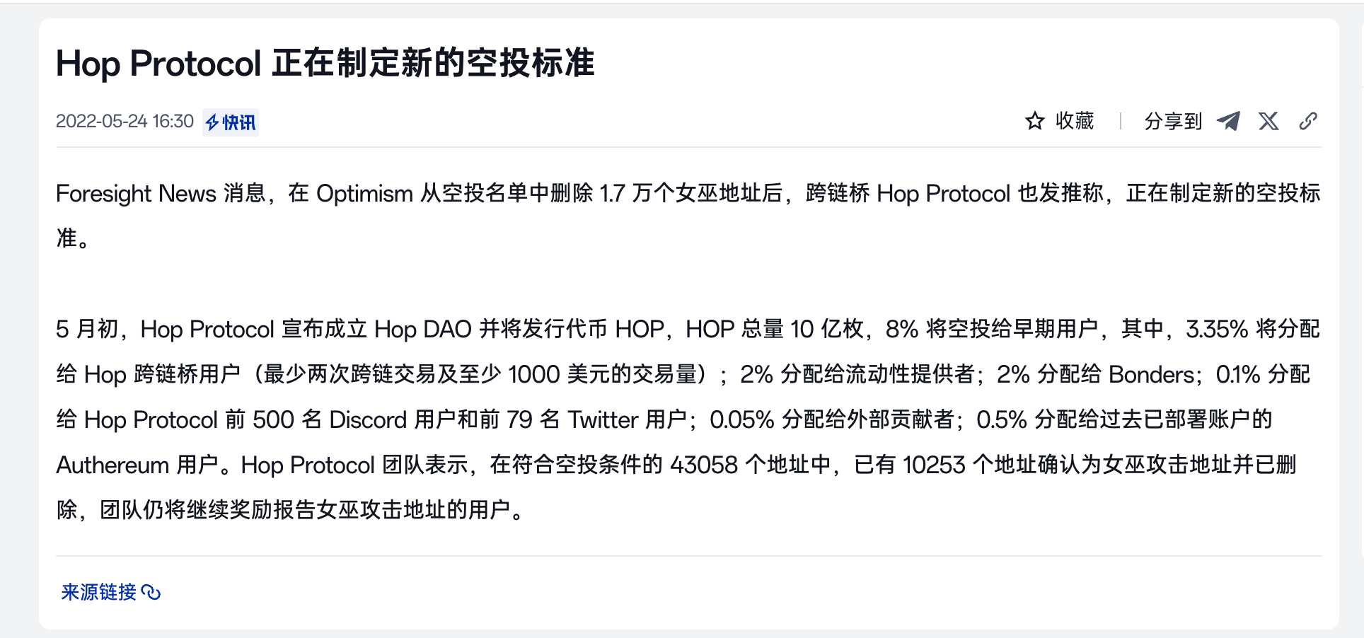 深远影响: HOP 之后,查女巫成了所有发币项目的「政治正确」,链上交互从「体验去中心化产品」变成了极致内耗的猫鼠游戏。打击女巫本身有其必要性,但把审查责任完全甩给社区、甚至鼓励互害的做法,严重破坏了社区生态。