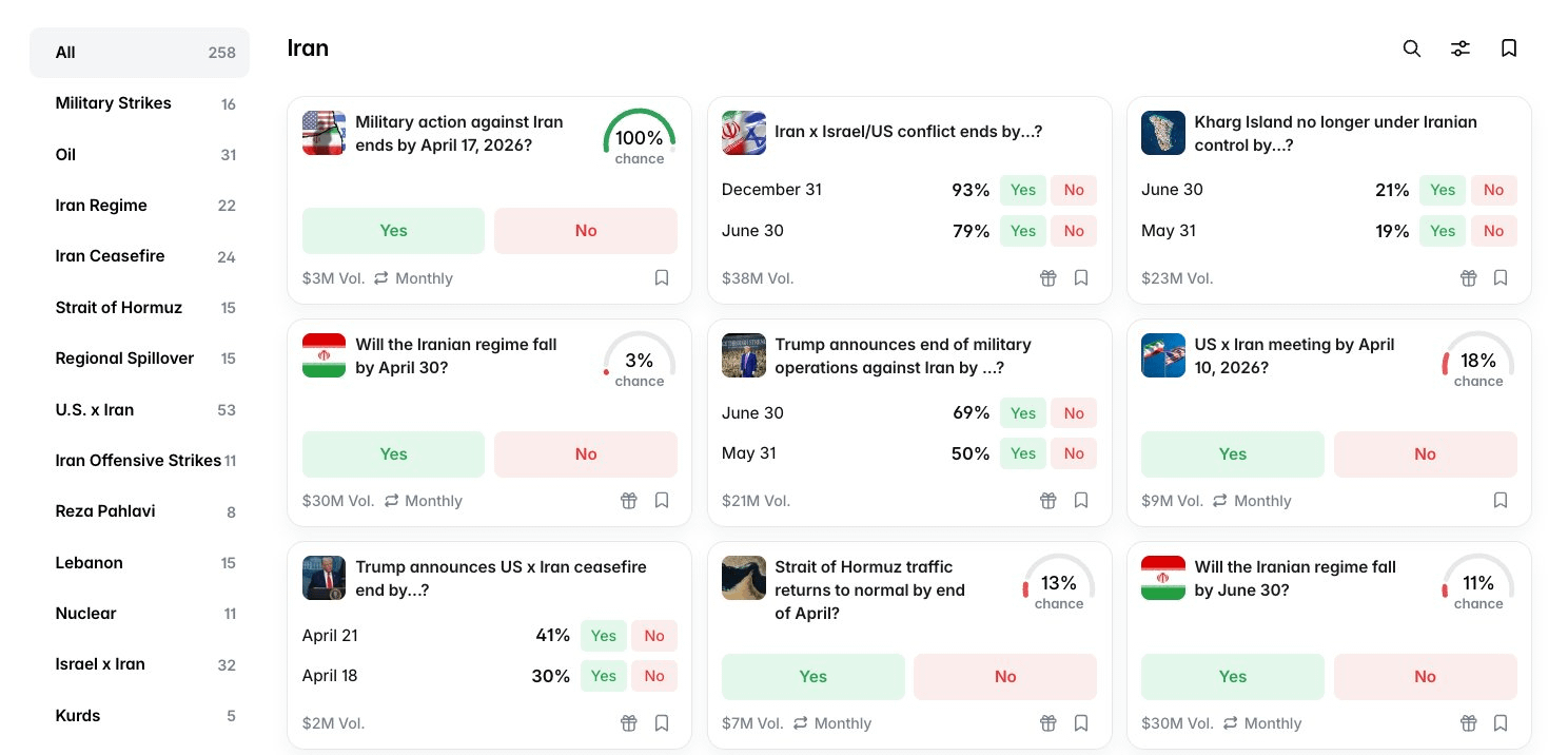 追踪伊朗政权稳定性。市场涵盖伊朗政权是否会在各时间节点前垮台、「礼萨·巴列维会否回国?」、「伊朗领导层会否更迭?」。