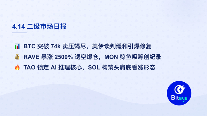 加密货币市场正处于熊市修复期的关键节点。由于美伊谈判在伊斯兰堡取得初步进展,市场避险情绪有所消退,总市值出现显著回升。比特币强势突破 74,000 美元,空头头寸遭到大规模清算。目前市场主线并不统一,资金正从宏观层面流向具备强庄控盘或硬核基本面的特定代币。尽管技术面回暖,但 4 月份的宏观压力仍需警惕,市场处于高选择性的“个体牛市”阶段。