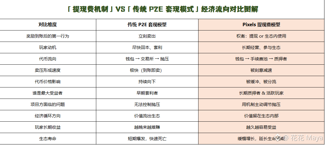 我们不妨来看一下,我整理的这张表格,里面清晰的可以看到传统链游和Pixels提现的区别。