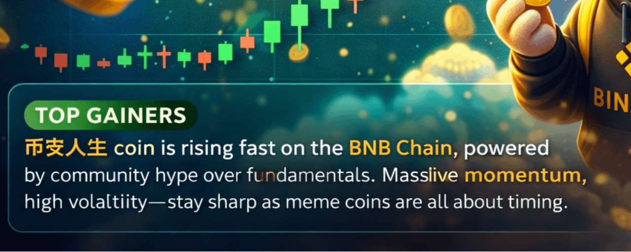 $币安人生 coin is quickly becoming one of the most talked about meme tokens on the BNB Chain, gaining attention after repeatedly appearing among Top Gainers lists. The coin’s rapid rise is fueled less by technical fundamentals and more by strong community energy, viral trends, and fast-moving traders looking for short-term opportunities.