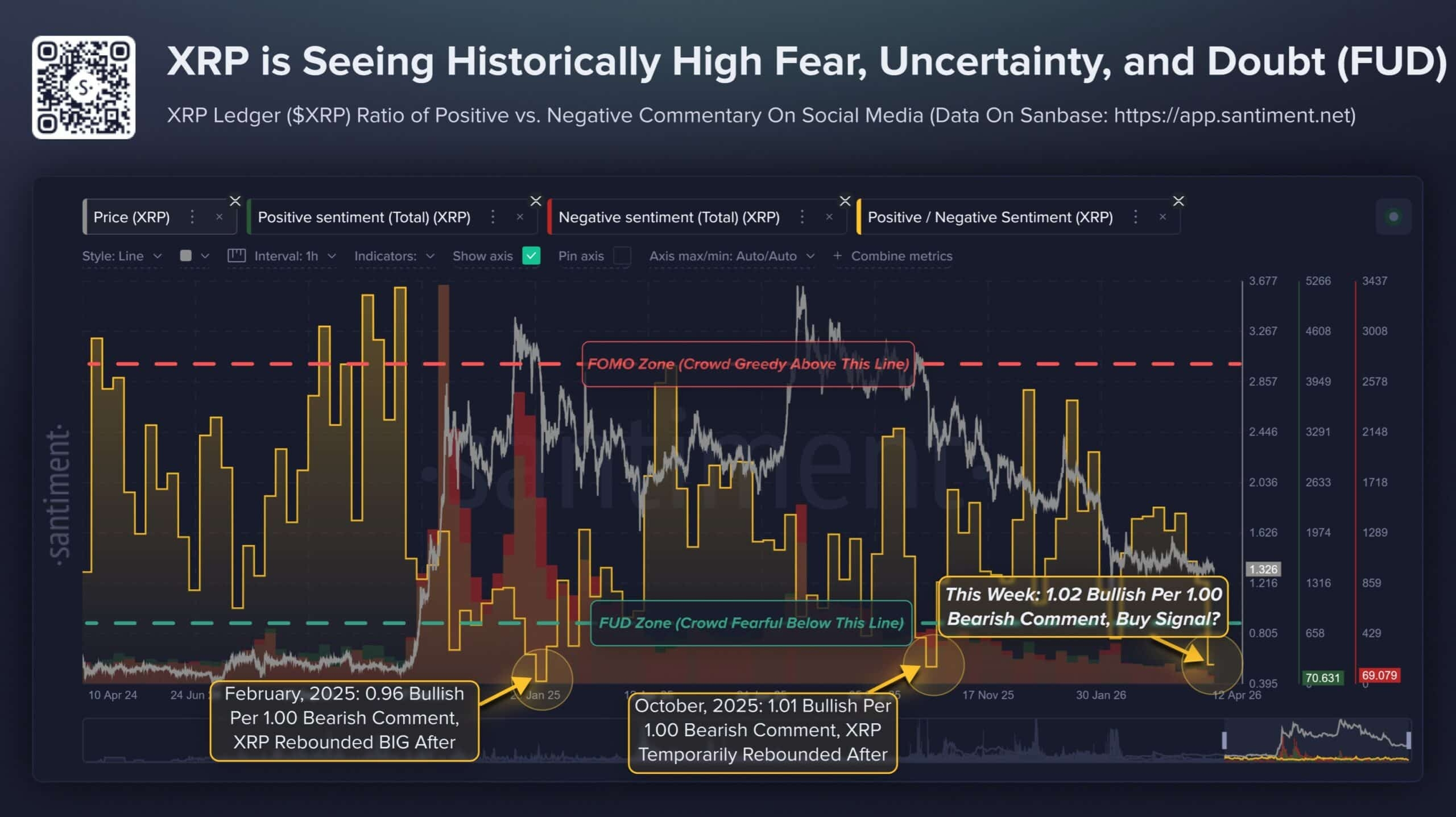 根据市场情绪数据,XRP的“恐惧与怀疑”(FUD)情绪已经升到近两年来的高位区域,接近历史极端水平。
