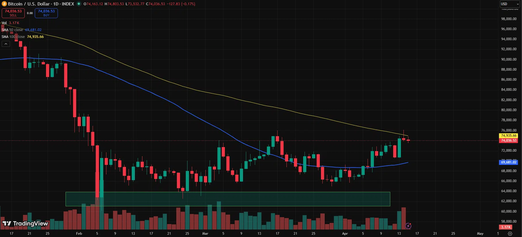 Tuttavia, le possibilità di un rally di Bitcoin rimangono. Il leader delle criptovalute continua a mantenere il livello di supporto micro a $72,000, come identificato dall'analista Michael van de Poppe. Notavelmente, BTC scambia a $74,036 al momento della scrittura.