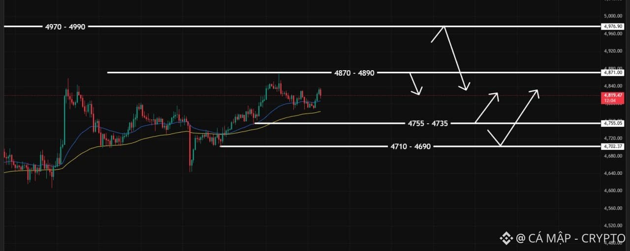 🔘 Vùng 1: quanh 4870 – 4890. Đây là vùng kháng cự gần nhất. Nếu giá tiếp cận lại khu vực này nhưng không thể phá vỡ, khả năng xuất hiện nhịp điều chỉnh là khá cao.