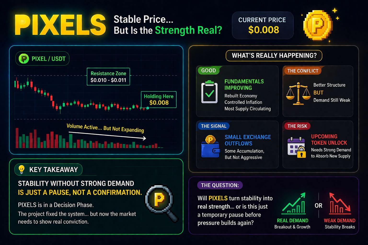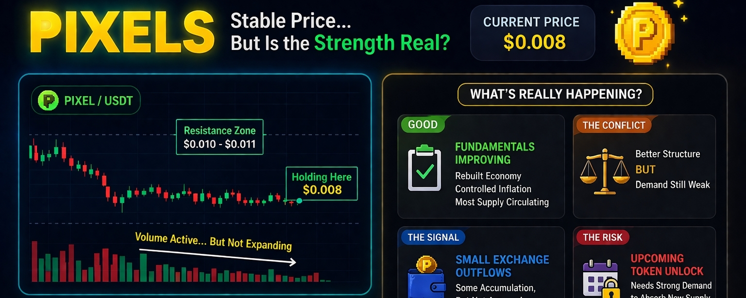 From what I’ve been observing in PIXEL, price is holding around the $0.008 zone, and on the surface, it feels like the market is finally calming down after the reset phase. But when I look deeper, the behavior tells a different story activity is there, but conviction still feels weak.
