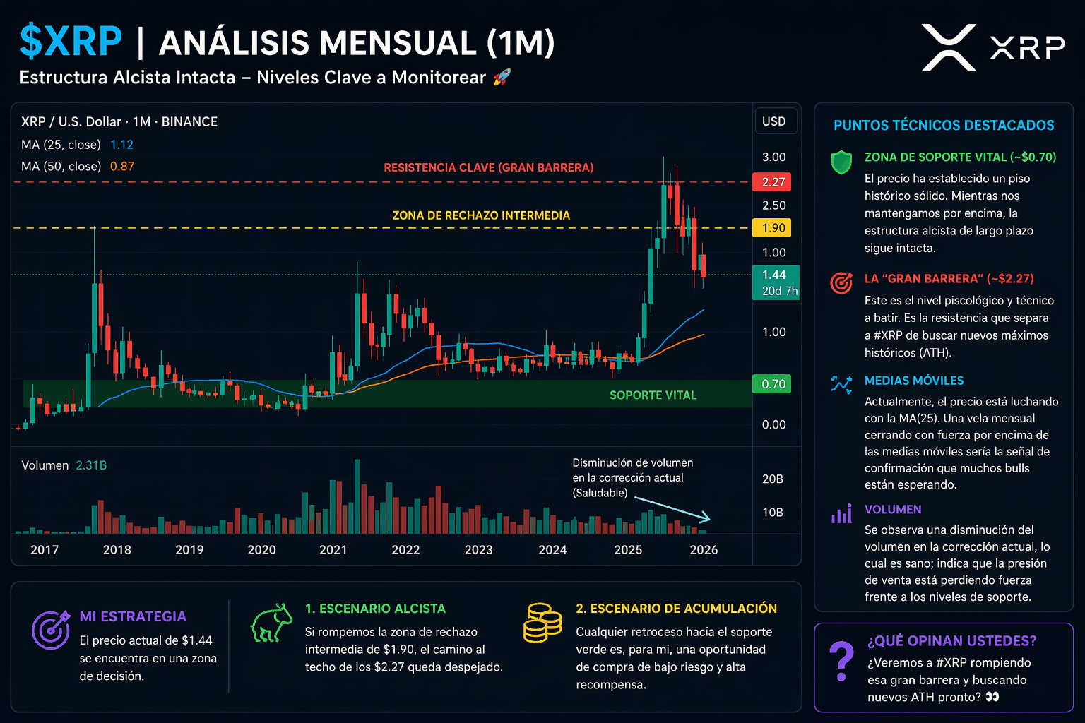 Mirando el gráfico de $XRP en temporalidad de 1 mes (1M), vemos un escenario de "limpieza" tras el último rally. Aquí los puntos clave para monitorear: