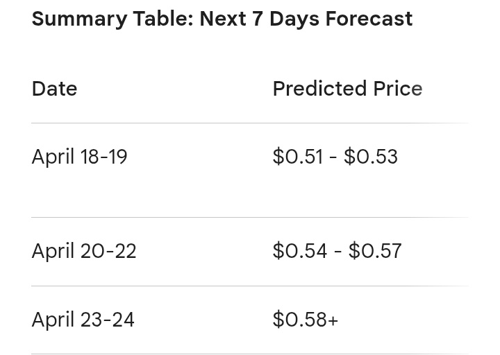 DatePredicted PriceTrendApril 18-19$0.51 - $0.53Consolidation / SidewaysApril 20-22$0.54 - $0.57Bullish MomentumApril 23-24$0.58+Potential Breakout