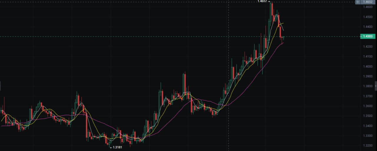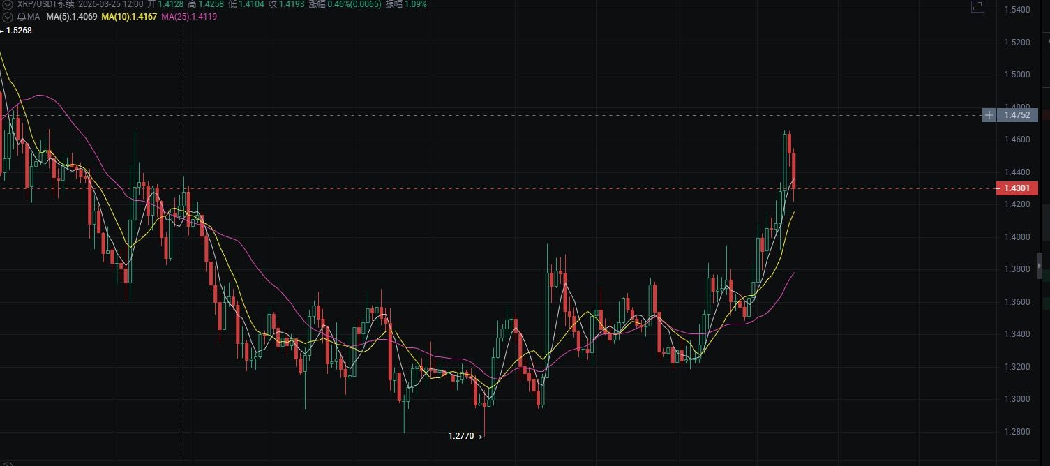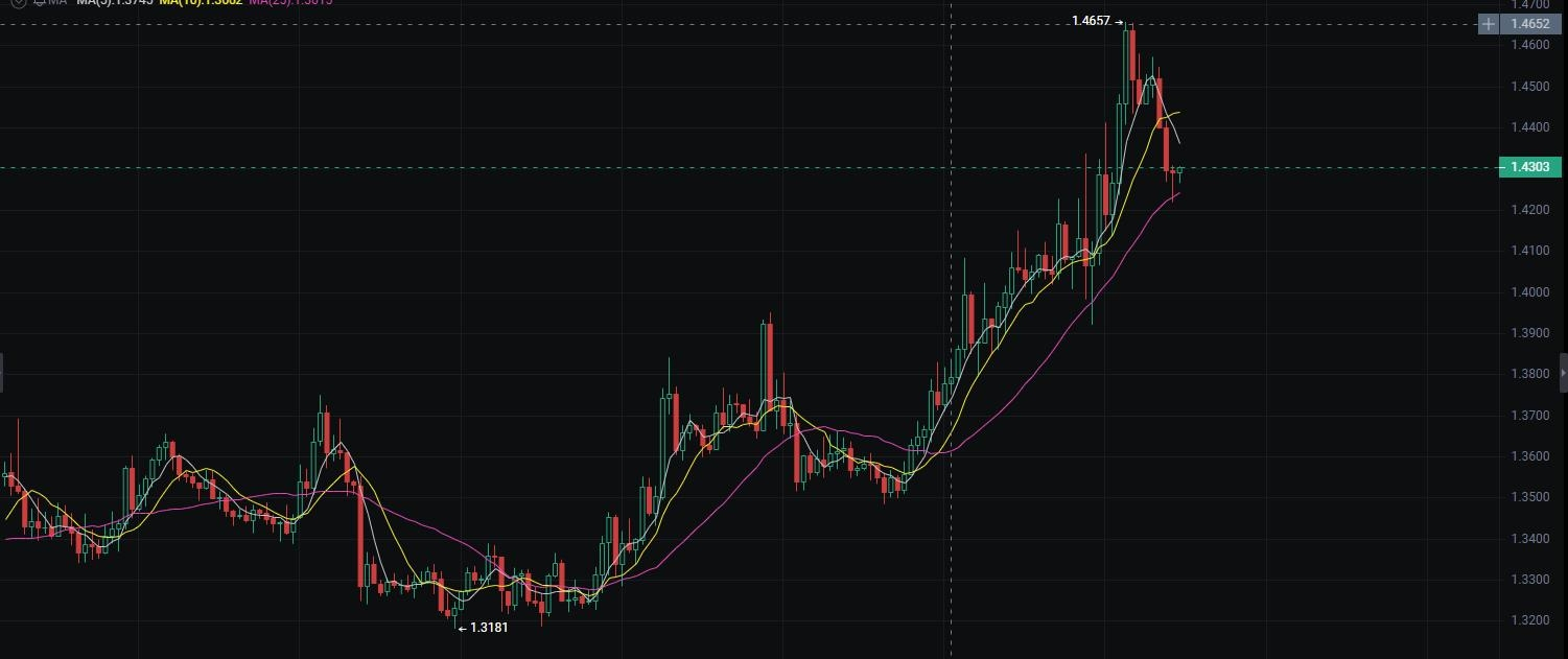 当前价格 1.43 已突破前期压力区(1.38–1.40)