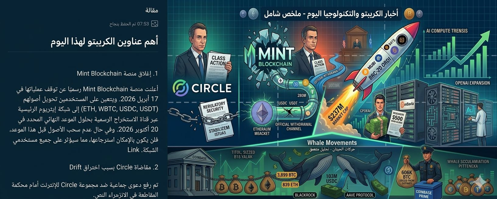 أعلنت منصة Mint Blockchain رسميًا عن توقف عملياتها في 17 أبريل 2026. ويتعيّن على المستخدمين تحويل أصولهم (ETH، WBTC، USDC، USDT) إلى شبكة إيثريوم الرئيسية عبر قناة الاستخراج الرسمية بحلول الموعد النهائي المحدّد في 20 أكتوبر 2026. وفي حال عدم سحب الأصول قبل هذا الموعد، فلن يكون بالإمكان استرجاعها، مما سيؤثر على جميع مستخدمي الشبكة. Link