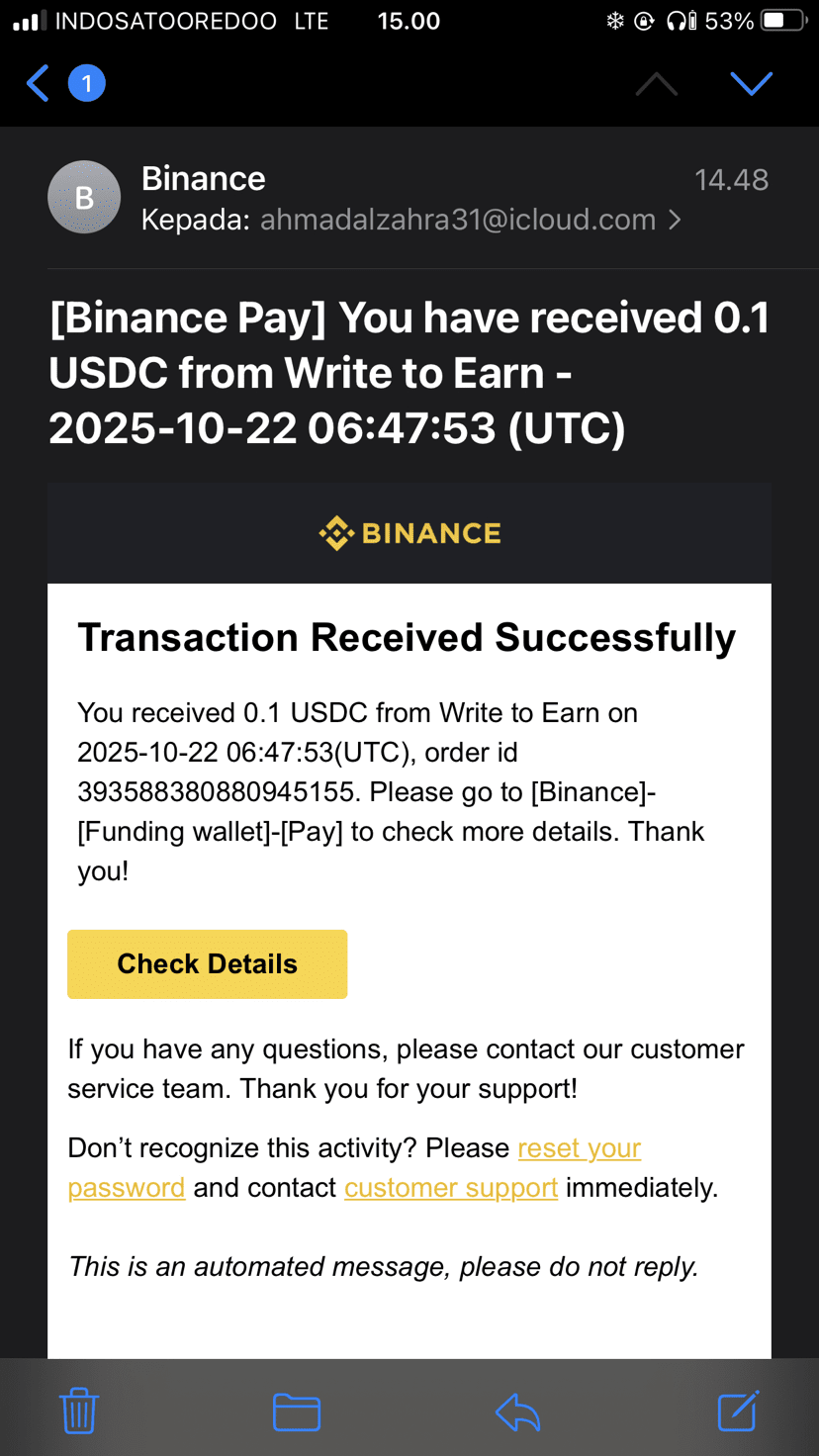 Grazie, Binance. Questa è la mia seconda ricompensa dal vostro programma Write to Earn. Nessun problema con il valore attuale, spero che aumenti in futuro, magari a 1000 USDC un giorno. E subito dopo aver ricevuto questa ricompensa, l'ho immediatamente scambiata in BIO coin. Grazie, Binance.