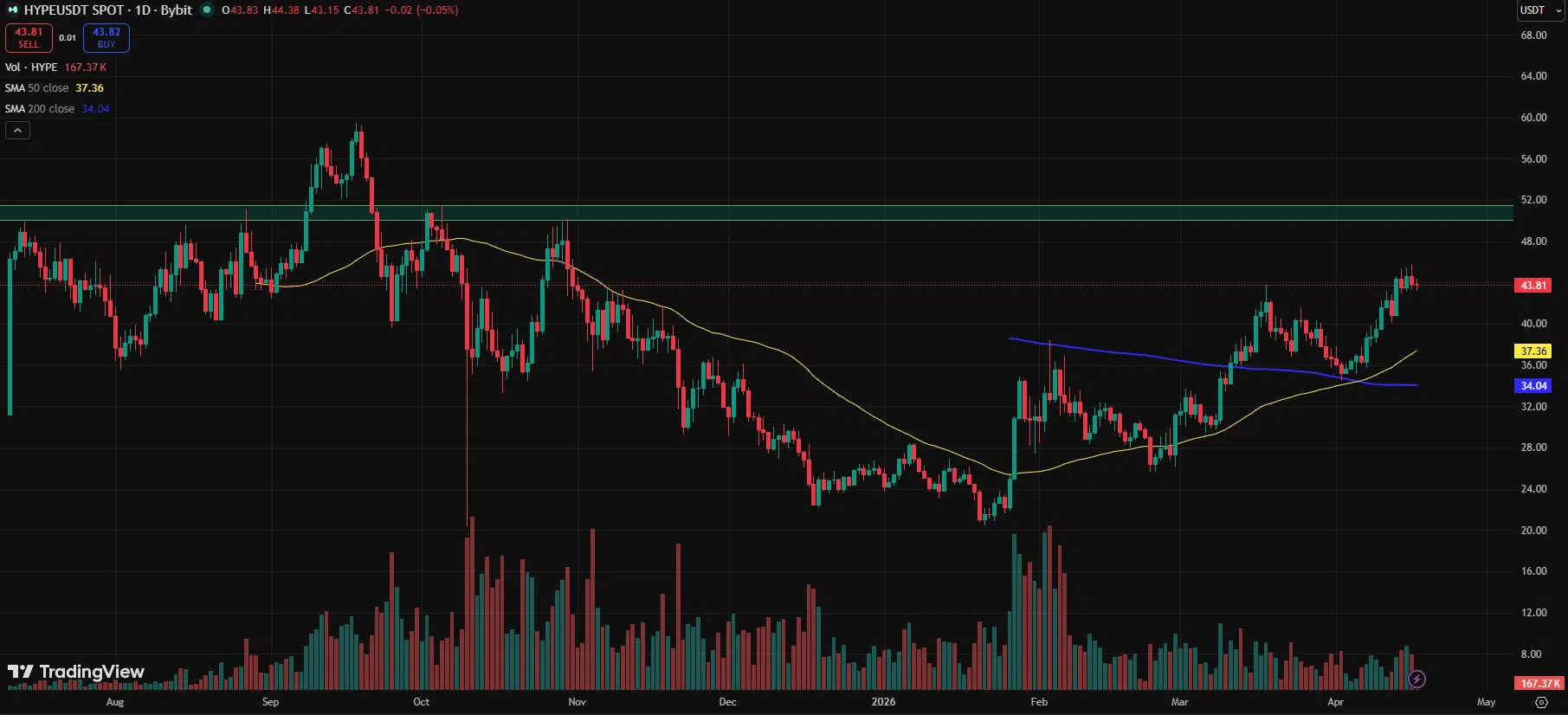 The earlier rally followed a well-formed higher low on the daily chart. After a higher high of $43.77 on March 18, HYPE started to pull back. It retested prior higher highs and eventually found support around $35 on April 2.