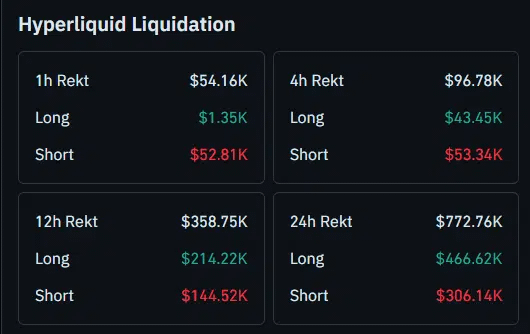 $466,620 were long positions, while $306,140 were short positions, reflecting the ongoing pullback. However, as HYPE has shown signs of stabilization, short liquidations have surpassed longs in the past 4 hours, with $53,340 for the former and $43,450 for the latter.