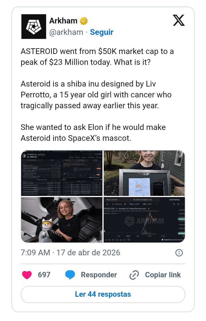 Teve até trader que fez uma bolada boa. A Arkham contou de um investidor, tal de 0x680, que trocou 1 Ethereum (uns US$ 2.400) por ASTEROID depois de um post do Elon Musk falando que ia comentar do assunto. Resultado: com a disparada, o cabra lucrou mais de US$ 474 mil em só três horas. É dinheiro demais da conta.