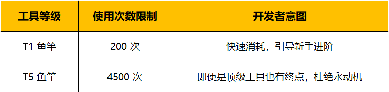 我们再来看,这次T5的更新还有一个重要的关键点,就是工具的耐久度变了。我们打个比方,以钓鱼为例: