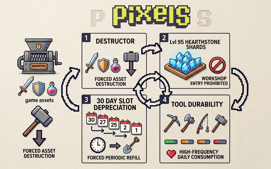生产行为被反转成了销毁行为。 解构器本质上是 Pixels 史上最大的水槽(Sink),强制把高阶玩家手中的存量资产转化成了生产成本,确保高价值材料永远处于供不应求的状态,而非无限堆积。