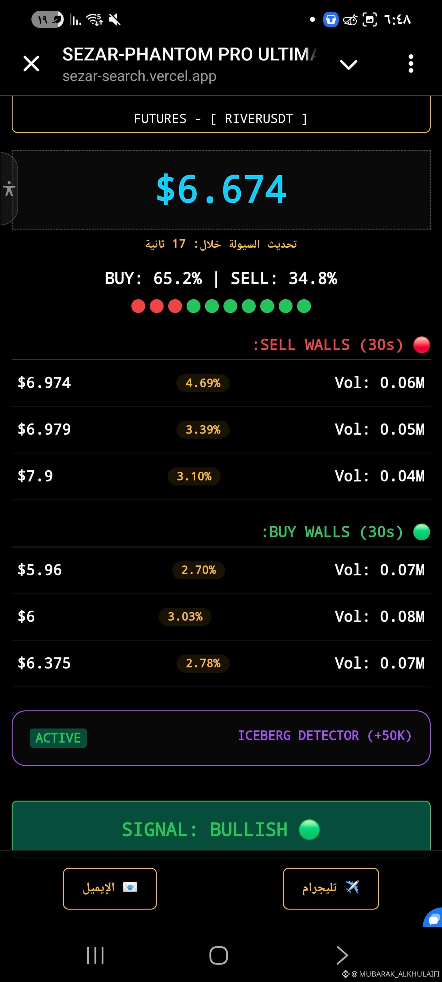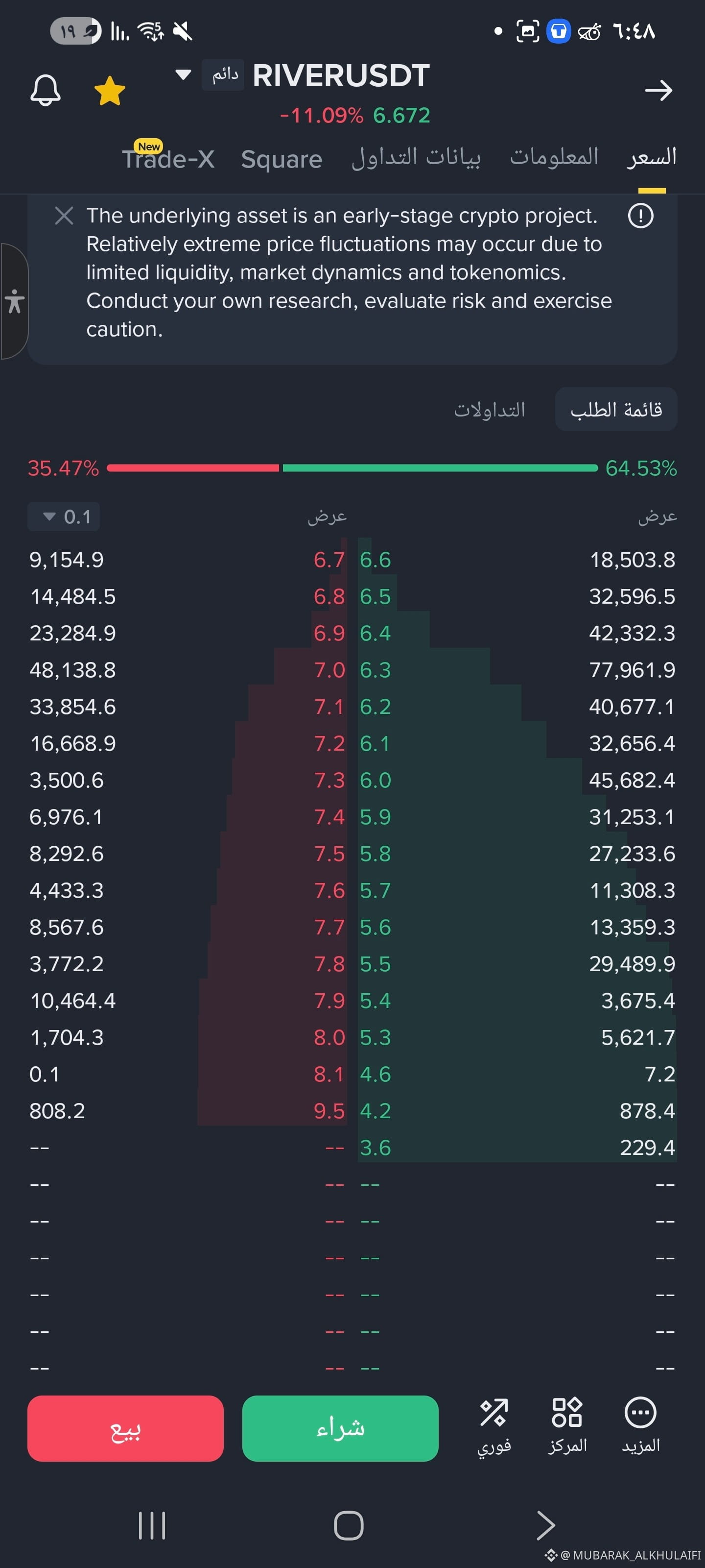 جدران الشراء (BUY WALLS): تظهر طلبات شراء قوية عند مستويات 6.37$ و 6$، وهي تعمل كدعم للسعر.