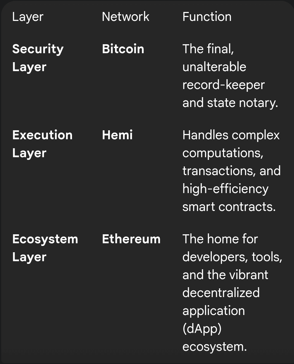 La visione di Hemi va oltre la semplice scalabilità; propone una nuova architettura per il Web3 dove i tre componenti principali si completano, piuttosto che competere, l'uno con l'altro: