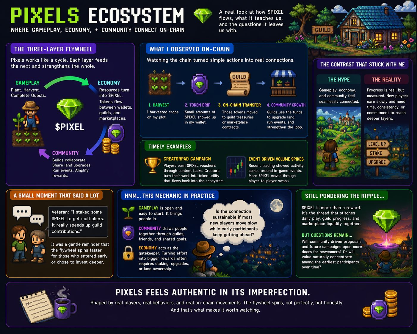 Pixels does not present itself as a perfect model. It reveals itself as a living structure where gameplay, economy, and community continuously interact, sometimes smoothly and sometimes with resistance. The flywheel spins, but not uniformly. It accelerates for some, stabilizes for others, and occasionally slows down in ways that invite scrutiny.