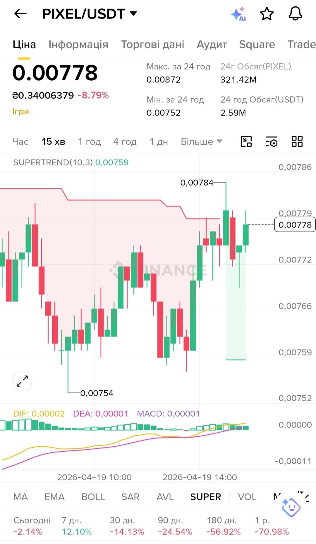 Головний страх тижня — розблокування монет 17 квітня — вже позаду. Ринок отримав значний обсяг нових токенів, але замість вільного падіння ми бачимо боротьбу за кожен пункт. Те, що через два дні після вестингу ціна тримається впевнено вище рівня 0.00730 (який ми бачили раніше), свідчить про силу покупців.