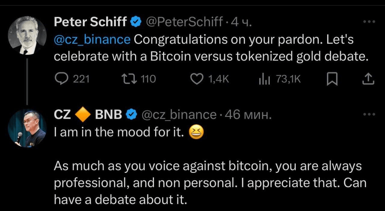 CZ ha accettato la sfida di Peter Schiff per un dibattito su $BTC e oro tokenizzato.