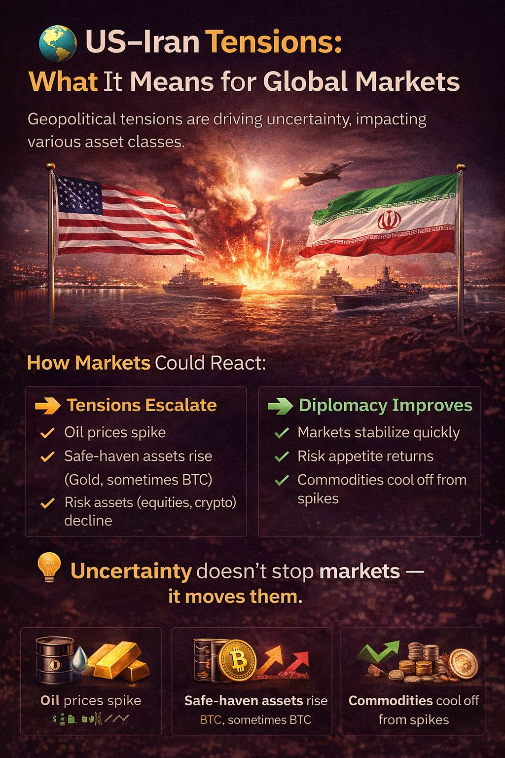 Tensions between United States and Iran have once again moved into focus, creating uncertainty across global markets. While there is no confirmed large-scale war, recent developments suggest a fragile situation where even small escalations can trigger significant reactions in financial assets. For traders and investors, this is less about politics and more about how markets respond to risk.
