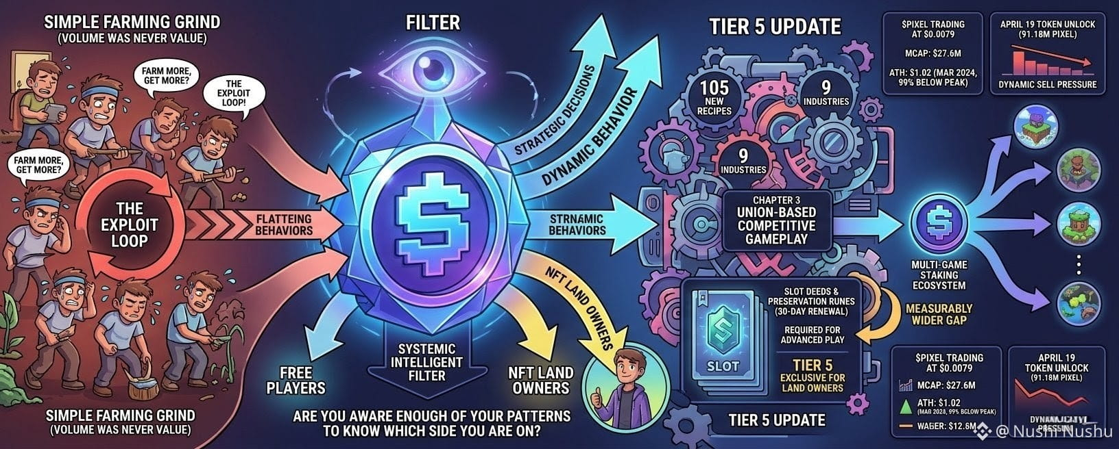 Before that Chapter 3 introduced Union-based competitive gameplay rewarding strategic decisions dynamically rather than raw activity. And the founder has publicly outlined a vision to expand $PIXEL across five to six games through a multi-game staking system turning the token into the economic backbone of an entire gaming ecosystem not just one farming title