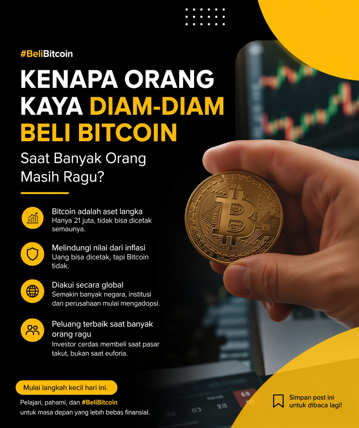 Investor besar memahami hal ini. Mereka tidak hanya menyimpan uang tunai, tetapi mencari aset yang memiliki potensi mempertahankan nilai dalam jangka panjang. Bitcoin menjadi salah satu pilihan karena sistemnya transparan, terdesentralisasi, dan pasokannya terbatas.