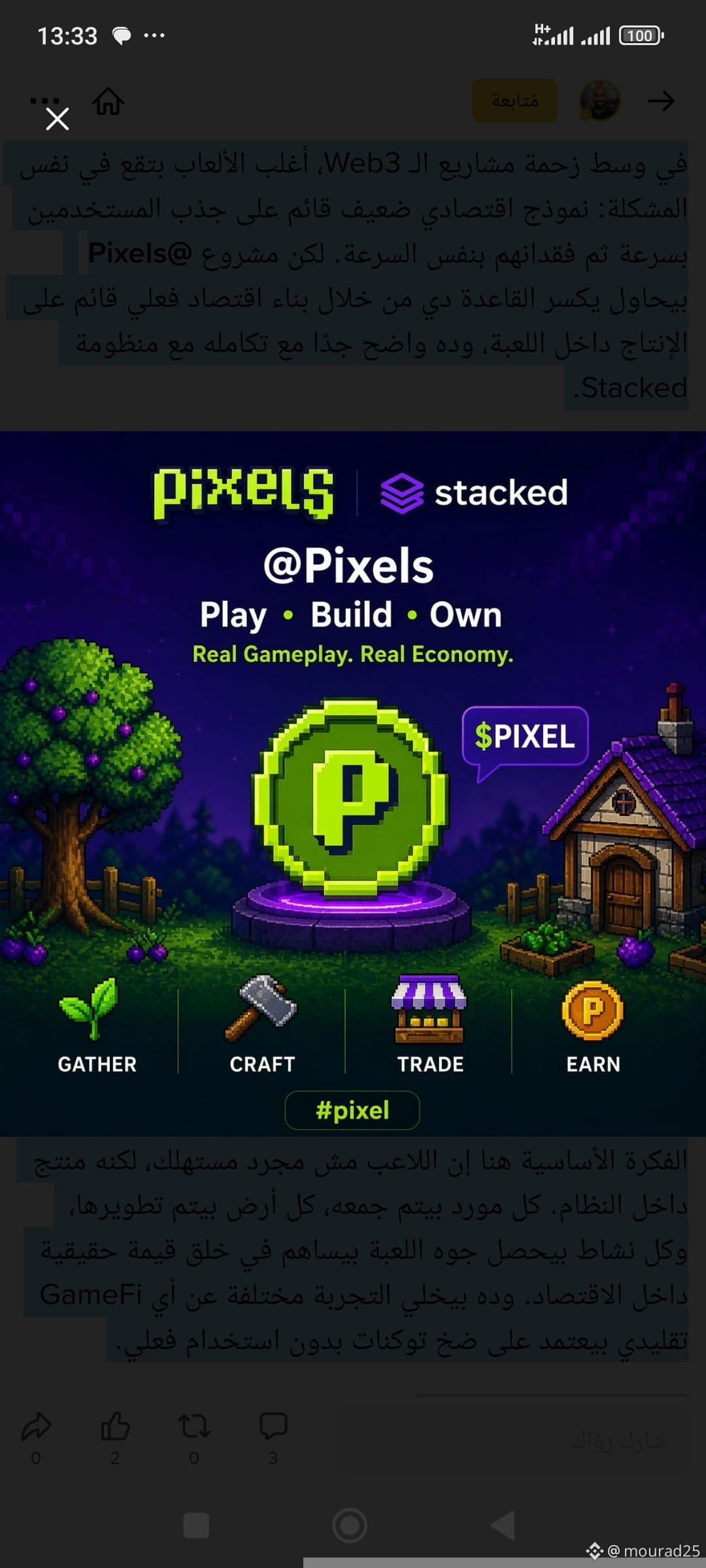 في وسط زحمة مشاريع الـ Web3، أغلب الألعاب بتقع في نفس المشكلة: نموذج اقتصادي ضعيف قائم على جذب المستخدمين بسرعة ثم فقدانهم بنفس السرعة. لكن مشروع @Pixels بيحاول يكسر القاعدة دي من خلال بناء اقتصاد فعلي قائم على الإنتاج داخل اللعبة، وده واضح جدًا مع تكامله مع منظومة Stacked.
