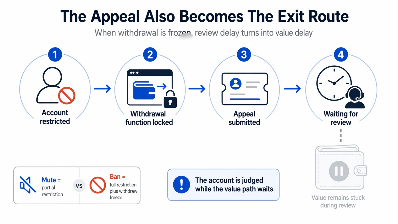 I also think this works better when kept that narrow. I do not need comparisons, extra theory, or bigger language around moderation. The scene already says enough by itself. The account gets banned and the first dashboard check fails. That failure is what makes the appeal matter differently. The ticket is not just asking whether the ban should stay. It is also the only path back to being able to move funds out. That is why the unanswered ticket matters so much. While it stays unanswered, the blocked withdraw path stays exactly where it was.