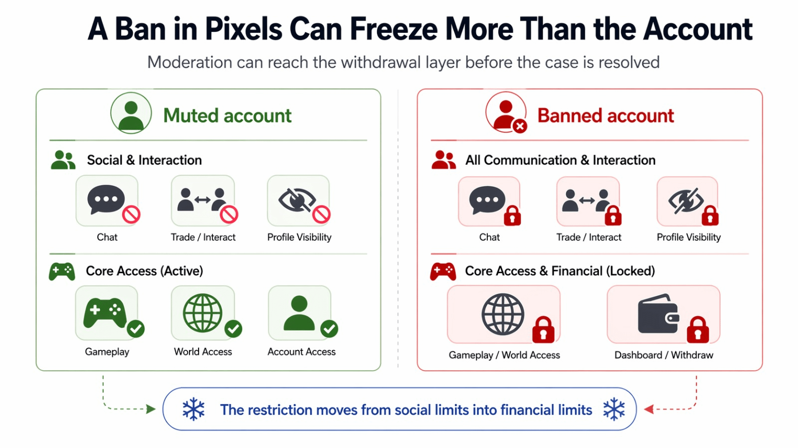 Pixels states the rule plainly. A banned account is completely restricted from using the game’s functions or dashboard functions such as withdraw. The appeal flow is just as simple. Submit a ticket and wait for an update. Put those two rules next to each other and the sequence becomes very clear. The ban happens first. The blocked withdraw path is already there. The ticket starts after that. So the account hits the dashboard lock before support has said anything back about the case.