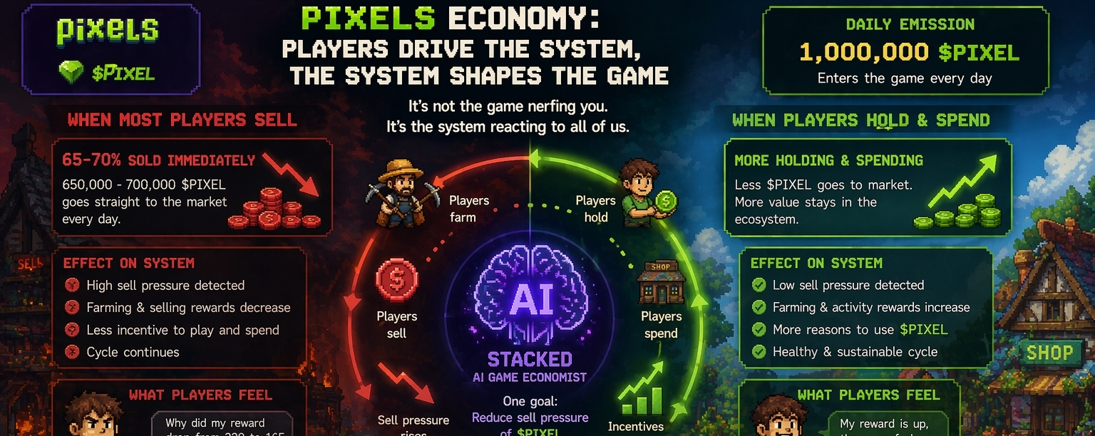 At the center of this design is a feedback loop that connects how players behave with how rewards are distributed. Roughly one million $PIXEL enters circulation each day. If a large percentage of that is instantly sold, the system detects rising sell pressure. When that happens, rewards tied to farming and extraction get reduced. On the other hand, if more players hold or spend their tokens inside the game, incentives shift in that direction.