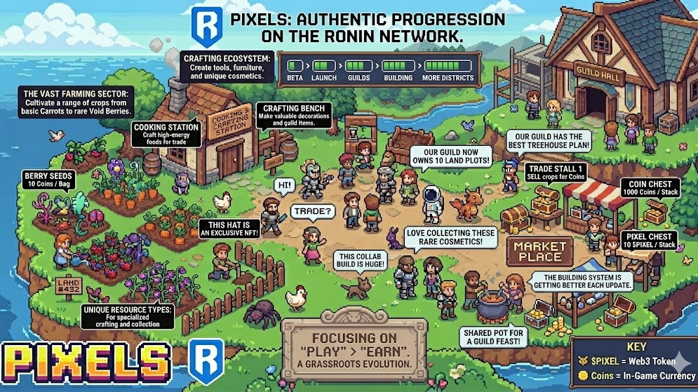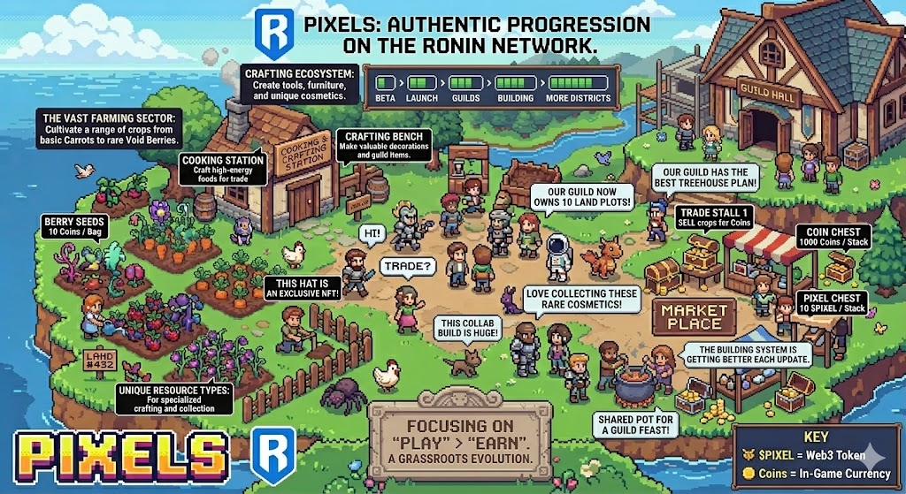 Most Web3 games lead with tokenomics. Pixels leads with gameplay. The blockchain bits are opt-in layers: