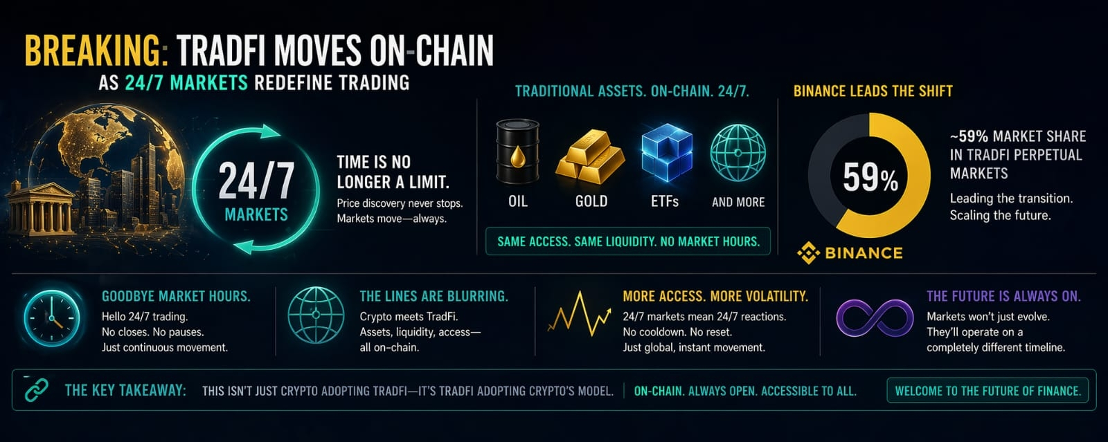 Da dove mi trovo, piattaforme come Binance sono al centro di questo cambiamento. Con circa il 59% di quota nei mercati perpetui di TradFi, e una crescente esposizione a beni come il petrolio, non stanno solo partecipando—stanno guidando la transizione. Quel livello di dominanza suggerisce che non siamo più nelle fasi iniziali—si sta scalando.