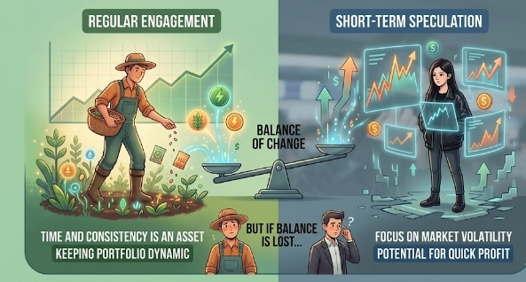 A regular farmer is creating resources with time every day, keeping the ecosystem running. On the other hand, a speculator is looking for short-term profit with early entry. If these two types of behavior are together, the system can survive, but if there is an imbalance, the pressure falls on the real active players.