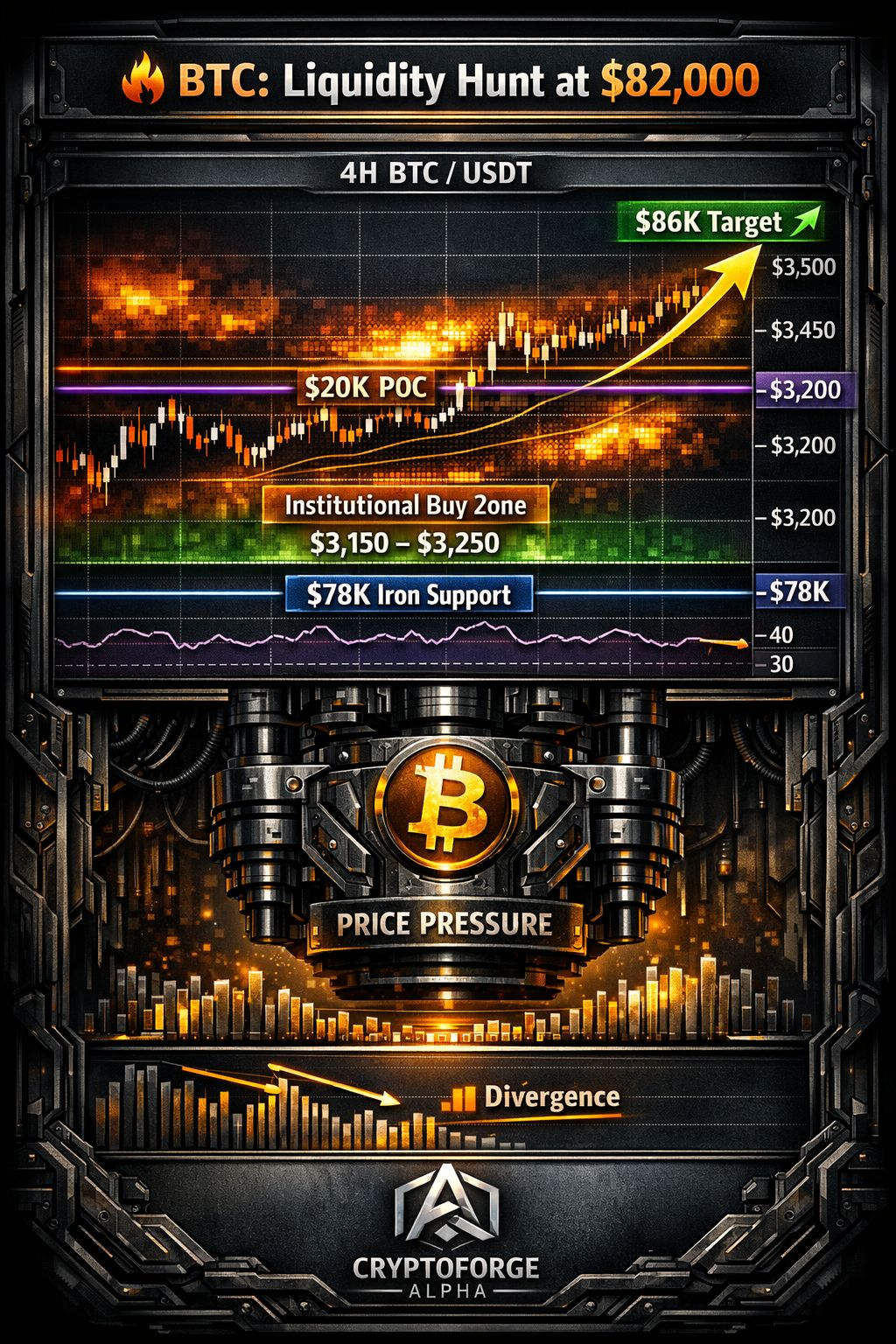 "Аналіз ліквідності Bitcoin (BTC) на квітень 2026. Карта ліквідацій показує ключову зону $82,000. Графік з рівнями POC $80,200, підтримкою на $78,000 та цілями на $86,000. Технічні індикатори RSI та EMA 50 від CryptoForge Alpha."