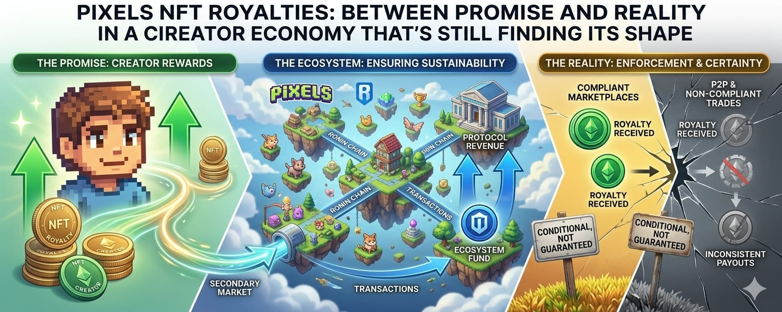In the end, Pixels offers a version of NFT royalties that feels more functional than most, but still grounded in the same limitations that define the space as a whole. It is a system that can support creators, but not one that removes uncertainty or guarantees outcomes. And maybe that is where the most honest understanding lands. Royalties are not a promise of future income, they are a possibility shaped by how people choose to trade, where they choose to trade, and how the ecosystem continues to evolve around them.
