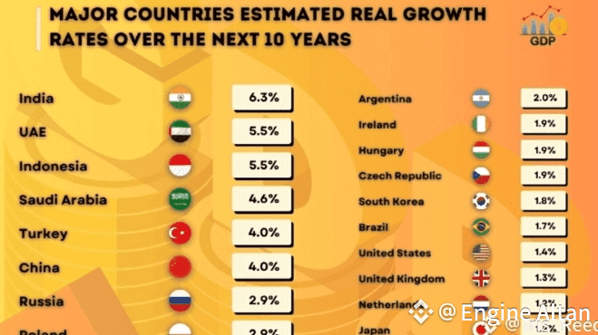 🇮🇳 L'India guida il gruppo con un tasso di crescita reale annuo previsto del 6,3%, il più alto tra tutte le principali economie. Forti demografie, rapida industrializzazione e sviluppo infrastrutturale su larga scala stanno consolidando la sua posizione come la principale economia in crescita del mondo.