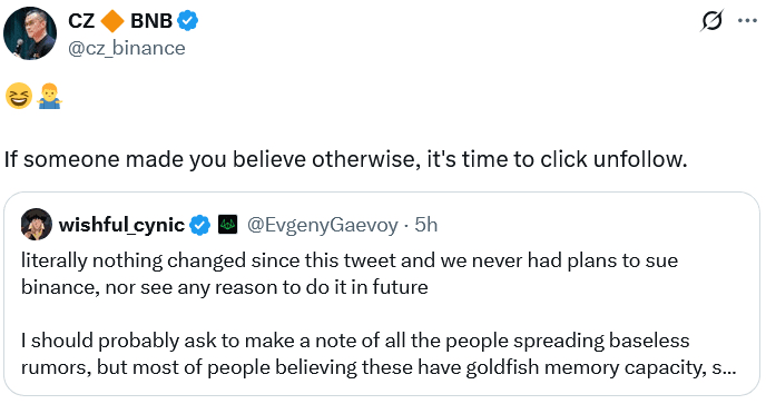 Anche l'ex CEO di Binance Changpeng Zhao (CZ) ha dovuto intervenire, ricordando ai suoi 10.4 milioni di follower: