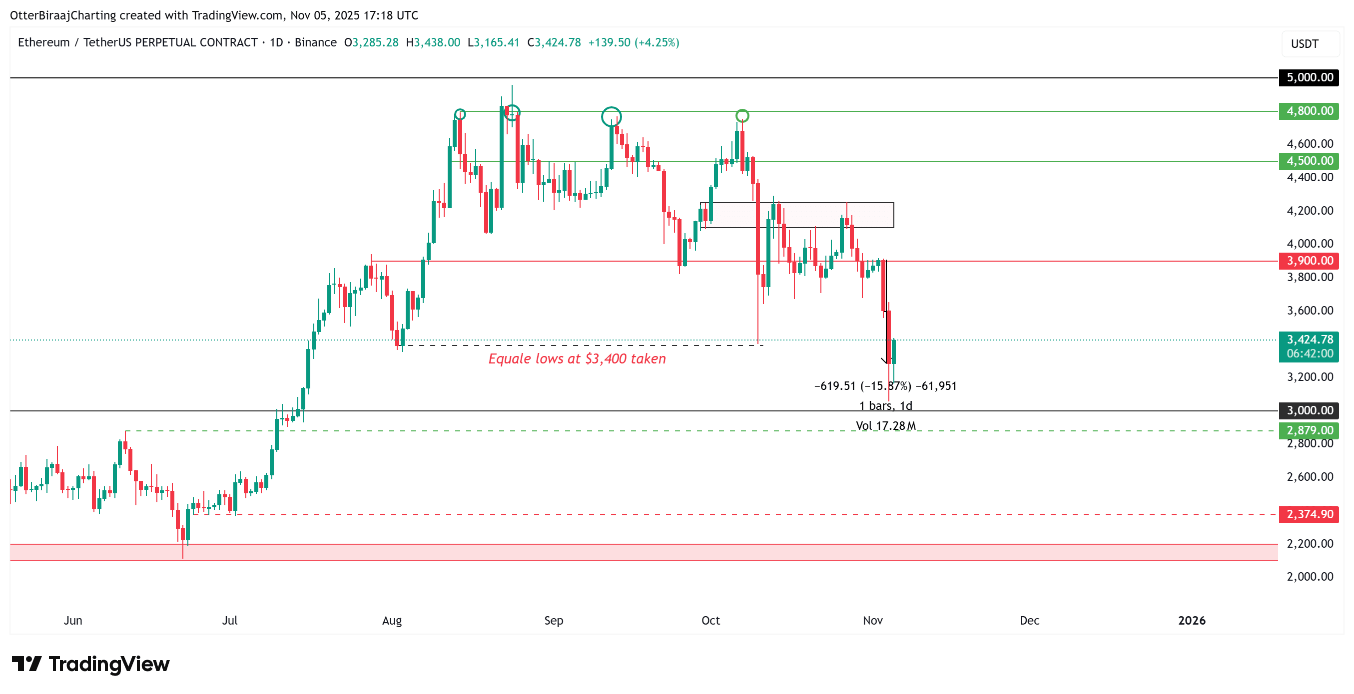 il prezzo è sceso a $3,055 martedì, estendendo il suo calo settimanale di oltre il 13%. La mossa ha eliminato la liquidità dai minimi uguali vicino a $3,400, una zona che aveva attirato un forte accumulo di leva. La prossima grande tasca di liquidità si trova ora tra $3,000 e $2,800, livelli che in precedenza hanno funzionato come supporti strutturali a lungo termine.