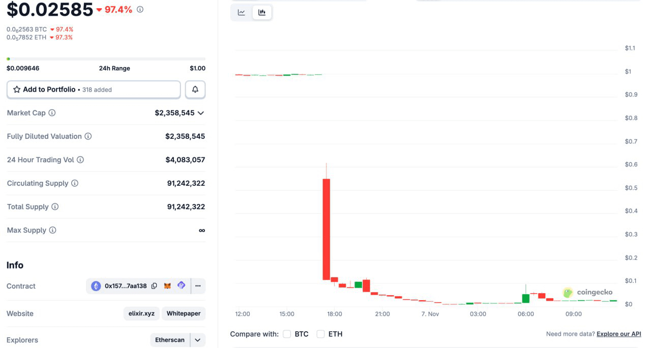 Uno degli ultimi casi scioccanti nel mondo DeFi: il stablecoin deUSD, emesso da Elixir Network, ha perso quasi completamente il suo legame con il dollaro dopo che il suo principale creditore, Stream Finance, ha subito perdite di circa $93 milioni.