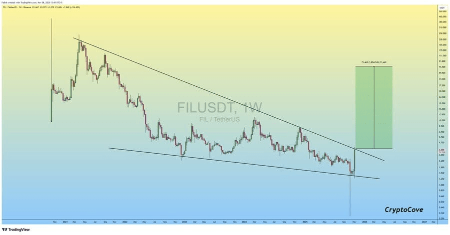 Secondo un analista crypto di primo piano, se la rottura si conferma, Filecoin potrebbe puntare a 64 $, un potenziale rally del 1.740% rispetto al suo prezzo attuale vicino a 3,30 $.