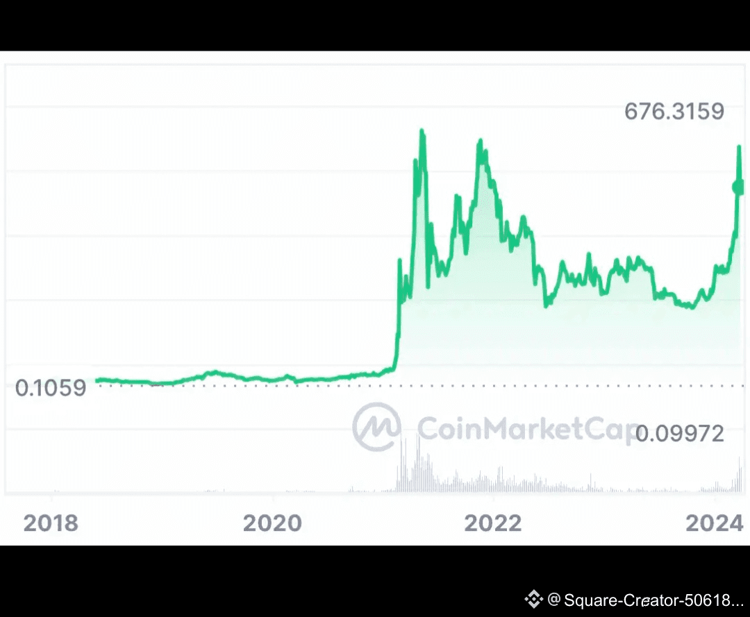 1. قفزات سعرية واضحة — سجلت BNB ارتفاعات كبيرة منذ 2021 إلى 2025 مع موجات ارتفاع وانسحابات تميّز السوق ككل. (مناطق ATH حديثة قِيمها محسوبة ومذكورة في صفحات السوق).