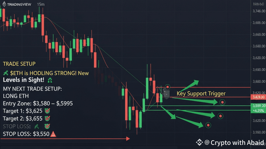 Ethereum $ETH sta mostrando seri attributi, attualmente scambiato intorno a 3,589.20 USDC (+4.25%) dopo un rimbalzo decisivo dal supporto di 3,582.25.