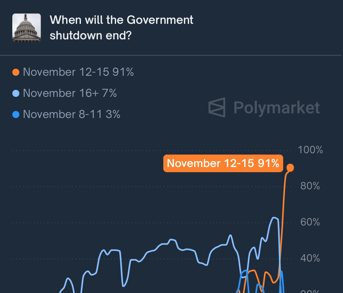 In un cambiamento drammatico, la probabilità che la chiusura del governo federale degli Stati Uniti finisca questa settimana è aumentata a ~91%, secondo l'attività di trading sulla piattaforma di mercato delle previsioni Polymarket. Questo forte aumento segnala una crescente fiducia del mercato che un accordo di finanziamento è imminente.